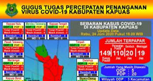 Rekapitulasi data sebaran Covid-19 yang selalu update dari Gugus Tugas Covid-19 Kabupaten Kapuas, dilaporkan Rabu per 24 Juni 2020, pukul 18.00 Wib KUALA KAPUAS (MELAYU POS INDONESIA) – Gugus Tugas Covid-19 Kabupaten Kapuas yang selalu aktif dalam menyuguhkan data terupdate dan terkoneksi dengan pihak RSUD Kapuas, Dinas Kesehatan Kabupaten Kapuas, maupun Dinkes Provinsi Kalimantan Tengah, … Lanjutkan membaca MOMEN TAMBAHAN PSBB, ELEMEN (DMK) MASYARAKAT DIMINTA WASPADA THD VIRUS CORONA