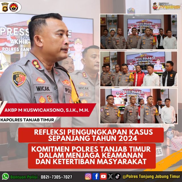 Tanjabtimur, Melayuposindonesia.com – Polres Tanjung Jabung Timur menggelar press release pengungkapan kasus sepanjang tahun 2024 di Aula Sanika Satya Wada. Selasa 31/12/2024.