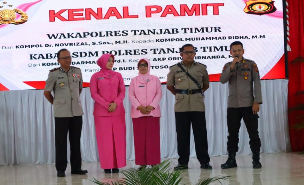 Tanjjabtim, Melayuposindonesia.com – Kapolres Tanjab Timur Rabu 15)10/2025) pagi menggelar upacara serahterima jabatan dilingkungan Polres Tanjab Timur, adapun jabatan yang diserahterimakan dari pejabat lama ke pejabat baru adalah Waka Polres Tanjab Timur dari Kompol Dr. Novrizal. S.Sos.,M.H kepada Kompol Muhammad Ridha, M.M. dan Kabag SDM Polres Tanjab Timur dari Kompol Darmadi, S. Pdi, kepada Akp Orivan Irnanda, S.H., kegiatan serahterima jabatan ini dilaksanakan di lapangan apel Mapolres Tanjab Timur.