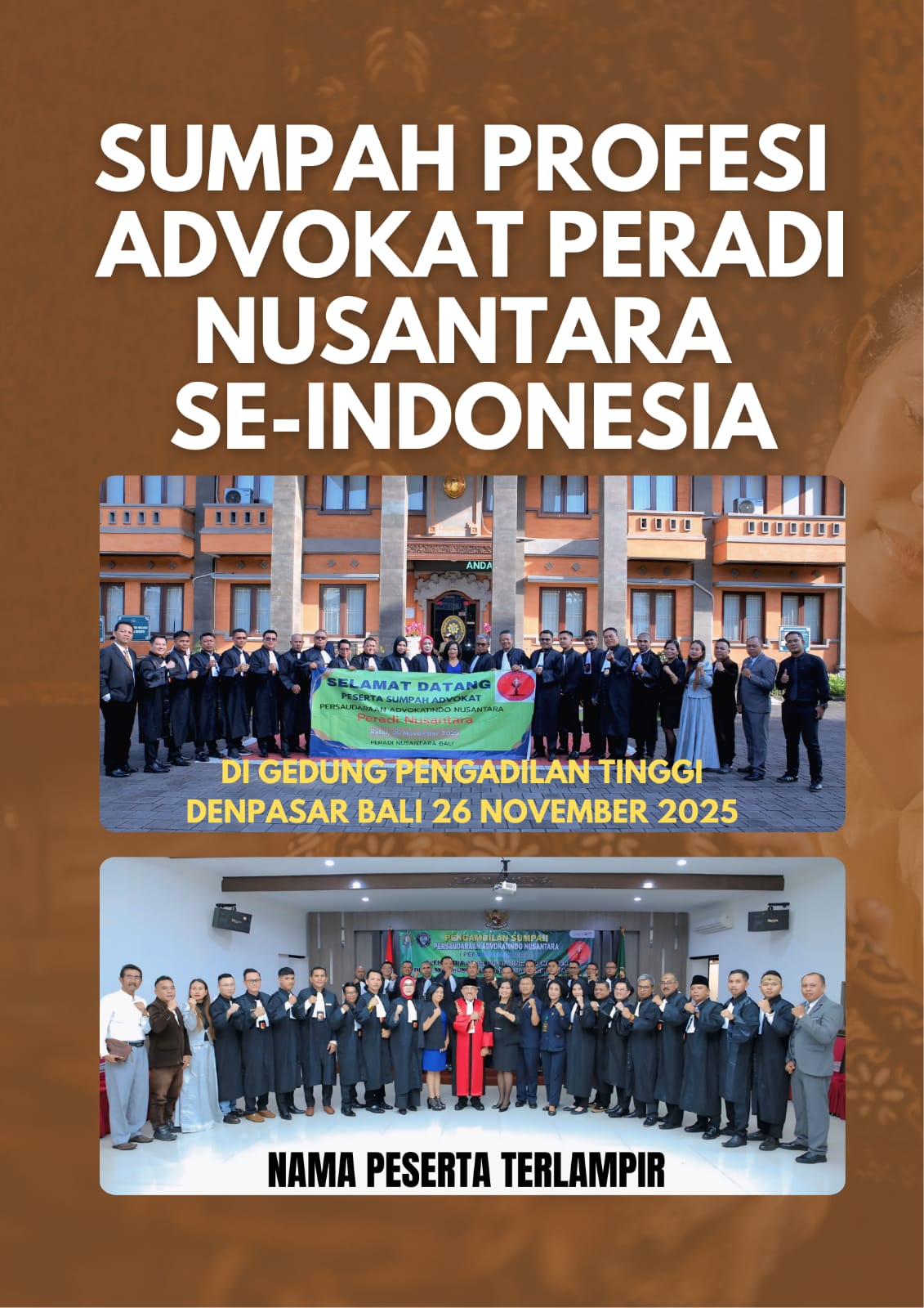 Berikut nama para lulusan PKPA-UPA Peradi Nusantara yang telah mengambil Sumpah Profesi Advokat di Pengadilan Tinggi Denpasar Bali, Rabu 26 November 2025 :